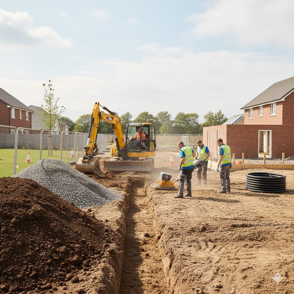 Trenching and Utilities: Digging trenches for services (water, electrics, gas) and installing essential pipework and ducting.